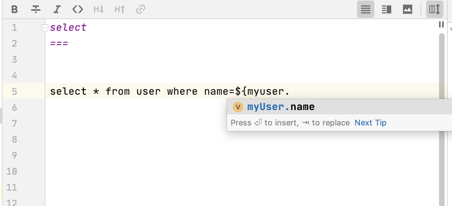 插件还提供了语法提示,比如,如下Mapper