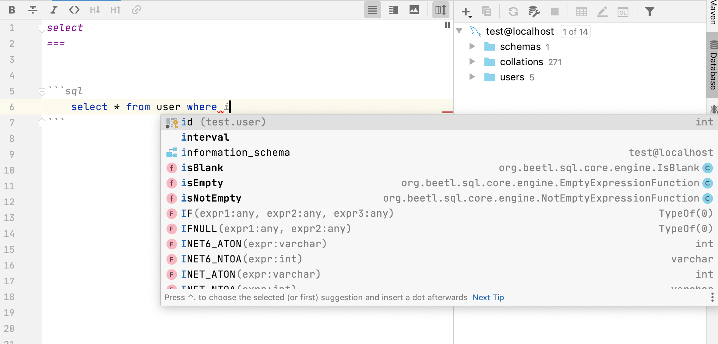 ```企业版能自动识别,并提示你配置一个数据源,这样,可以在sql片段里更好的编写sql语句,即提供SQL语法,有也提供beetlsql语法